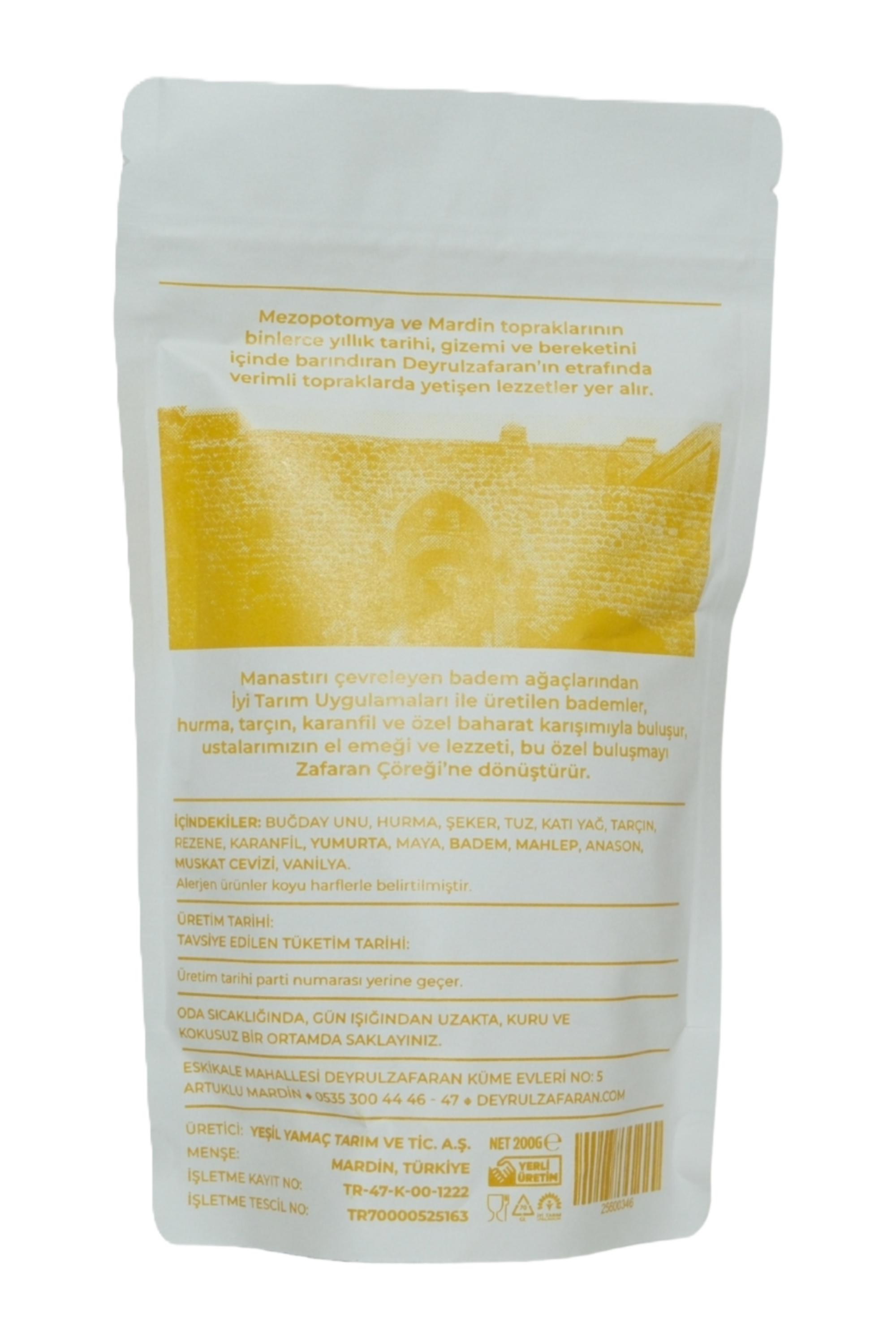 Manastırı çevreleyen badem ağaçlarından İyi Tarım Uygulamaları ile üretilen bademler hurma, tarçın, karanfil ve özel baharat karışımıyla buluşur, ustalarımızın el emeği ve lezzeti, bu özel buluşmayı Zafaran Çöreği'ne dönüştürür.